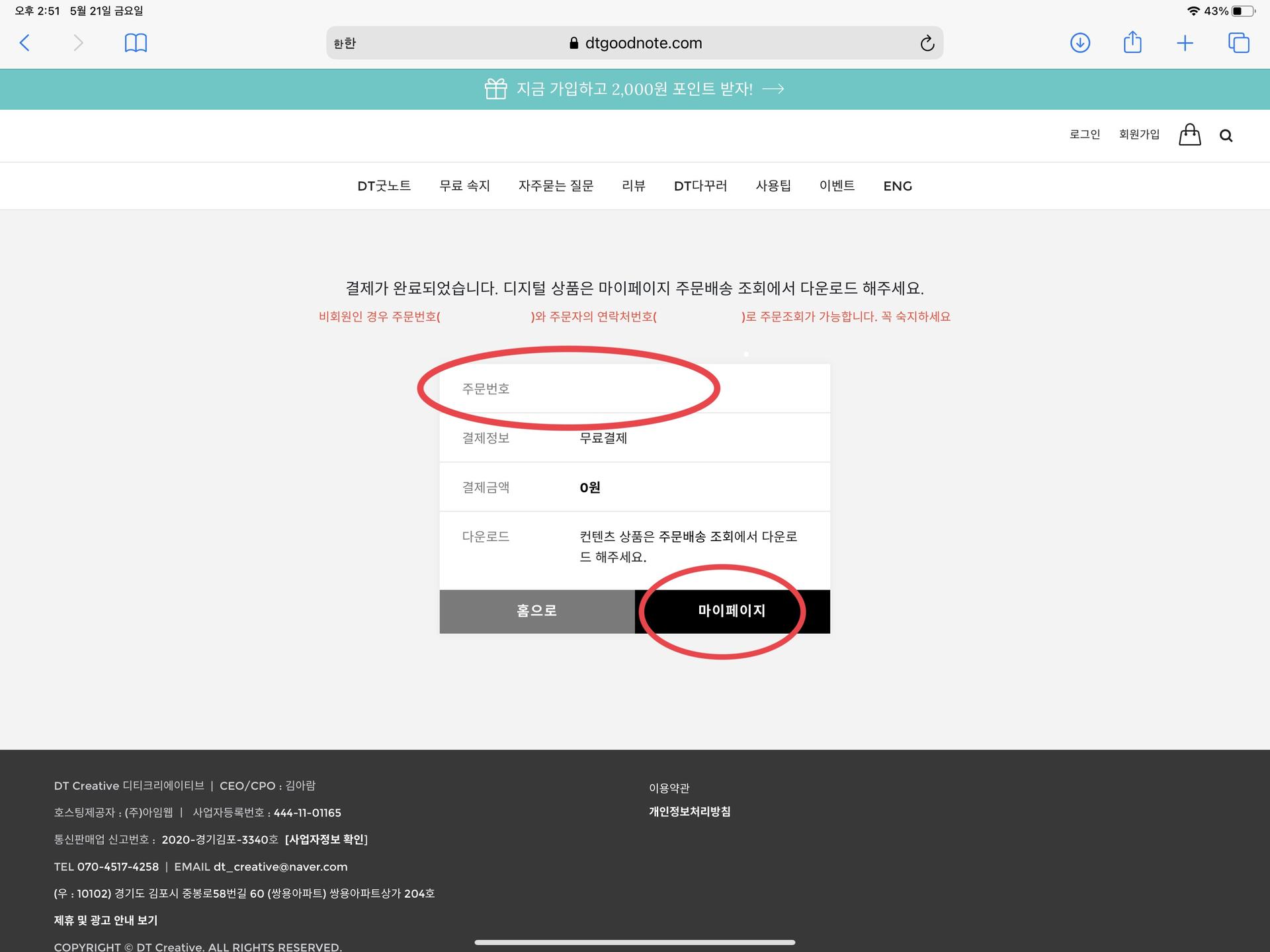 결제 완료 하면 나타나는 주문번호를 복사해 둔 뒤 마이페이지를 클릭하여 주문번호로 다운로드 합니다.